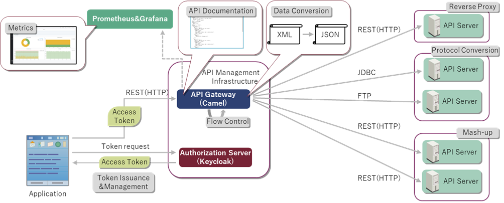 As shown in the picture below, the API management infrastructure can perform reverse proxy, protocol conversion, data conversion, mash-up, flow control, API documentation publishing and metrics. Besides, it also can perform simple API authorization by token issuance & management that is provided by Keycloak.